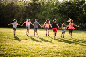 Back view group of children running in park at sunny day
